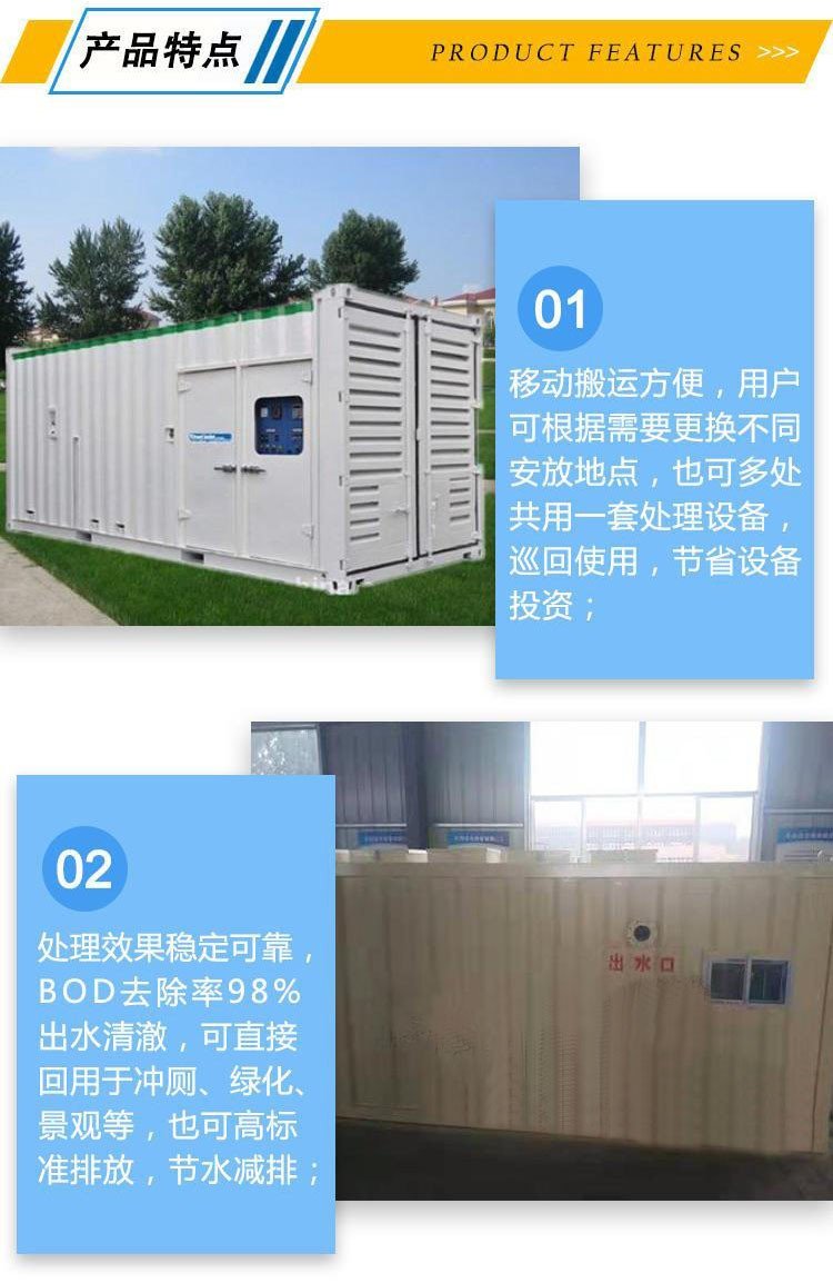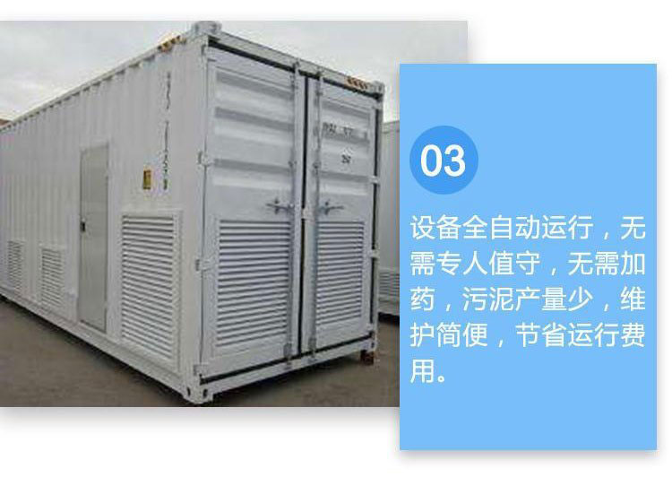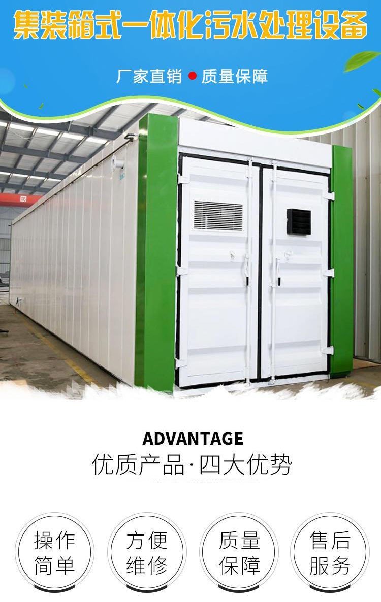 集装箱污水处理设备采用生物处理工艺,集去除BOD5、COD、NH3-N于一身,具有技术性能稳定可靠,处理效果好,投资省,占地少,维护方便等优点。也可根据客户要求同时配套中水回用设备。该设备广泛应用于农村生活污水处理、食品厂污水处理、洗涤厂污水处理、医院污水处理、屠宰污水处理,经该设备处理的出水水质,可以达到一级A排放标准。全套设备既可安装在地面上,也可埋设于地下,故亦称地埋式污水处理设备。